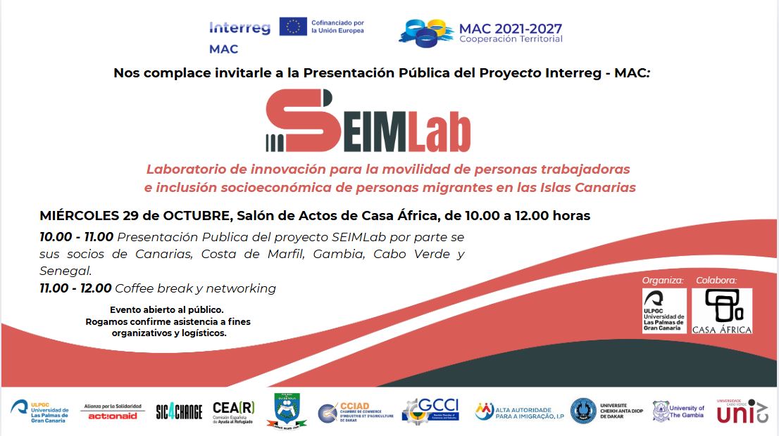 Presentamos SEIMLab: laboratorio de innovación para la movilidad de personas trabajadoras e inclusión socioeconómica de personas migrantes en las Islas Canarias. Una iniciativa pionera que une a socios de Canarias, Senegal, Gambia, Costa de Marfil y Cabo Verde para repensar los caminos de la movilidad y la inclusión de las personas migrantes.