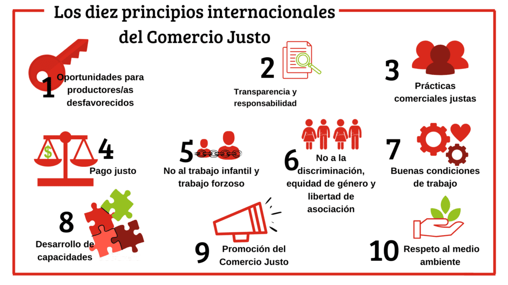 - Precio justo: con el comercio justo los precios se establecen de mutuo acuerdo, lo que significa que la remuneración para todos lo actores que intervienen en la cadena es justa.